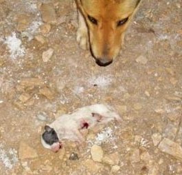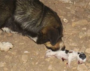 Here are the descriptions of the pictures: dogs are eating their new born puppies, most of them are severely injured, for some of them it was too late, and dogs have started to eat each other.