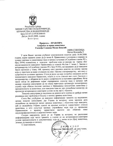 Mr. Marinkovic has now been informed that he has to personally inform every one of the 24 veterinary regions in Serbia and inform them that Pravilinik 29/94 is illegal and cannot be used as justification for killing animals.  He has also been informed that this needs to be stated officially on the Ministry web sites.