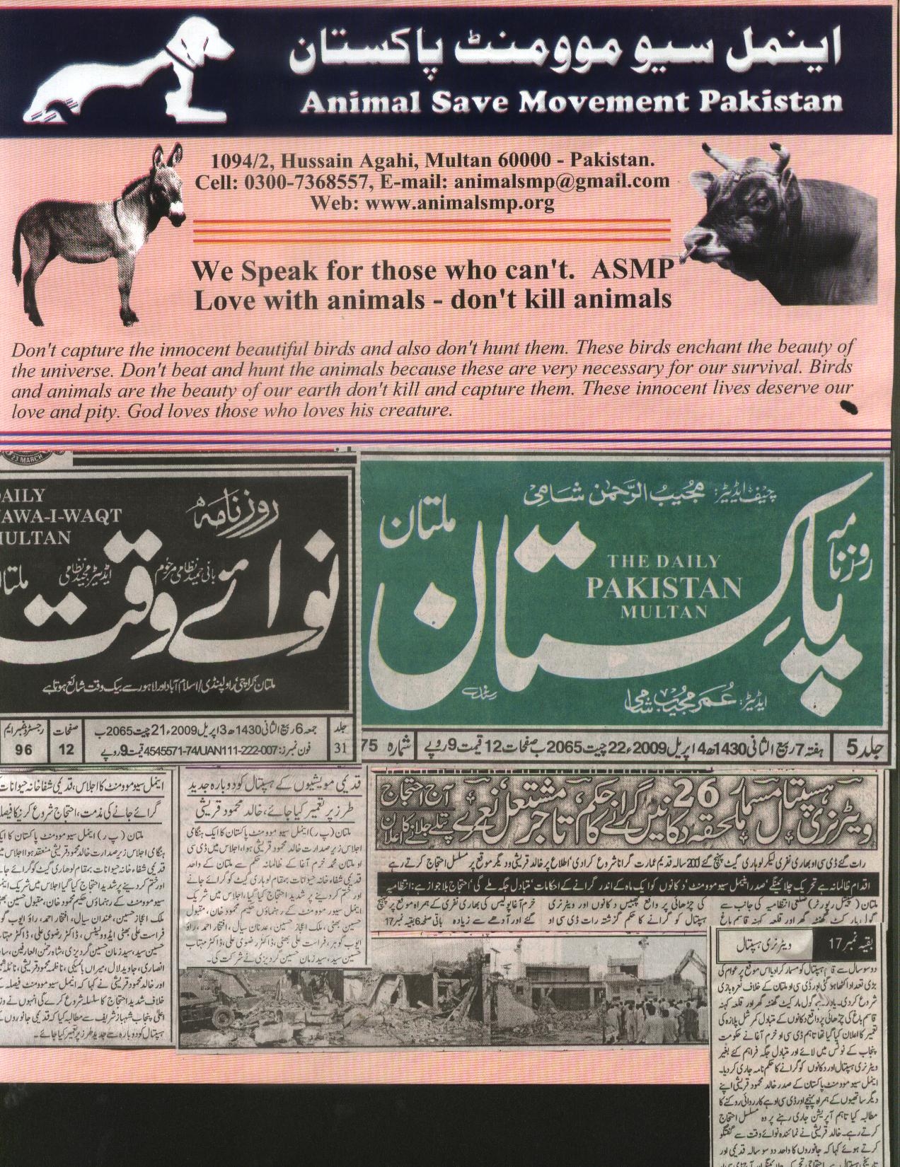 Animal Save Movement Pakistan protested this brutal cruel act of punjab government. ASMP demanded that Punjab Gov’t rebuilt the Veterinary Hospital. ASMP appeal Friends of Animals that they also protest against this act of cruelty and send mails to the Gove’t of Pakistan .Animals are creation of God and they require our attention. Many animals near us spend their lives without the basic necessities of life such as good food, healthcare facilities and shelter. Pets and animals enrich our lives in many ways and in return they require attention, welfare and protection from us.
