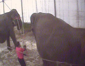 In addition to the casual violence, the elephants were also limited for long periods of the day in a small tent and chained tightly every night for up to eleven hours with only enough room to take one step forward or backwards.