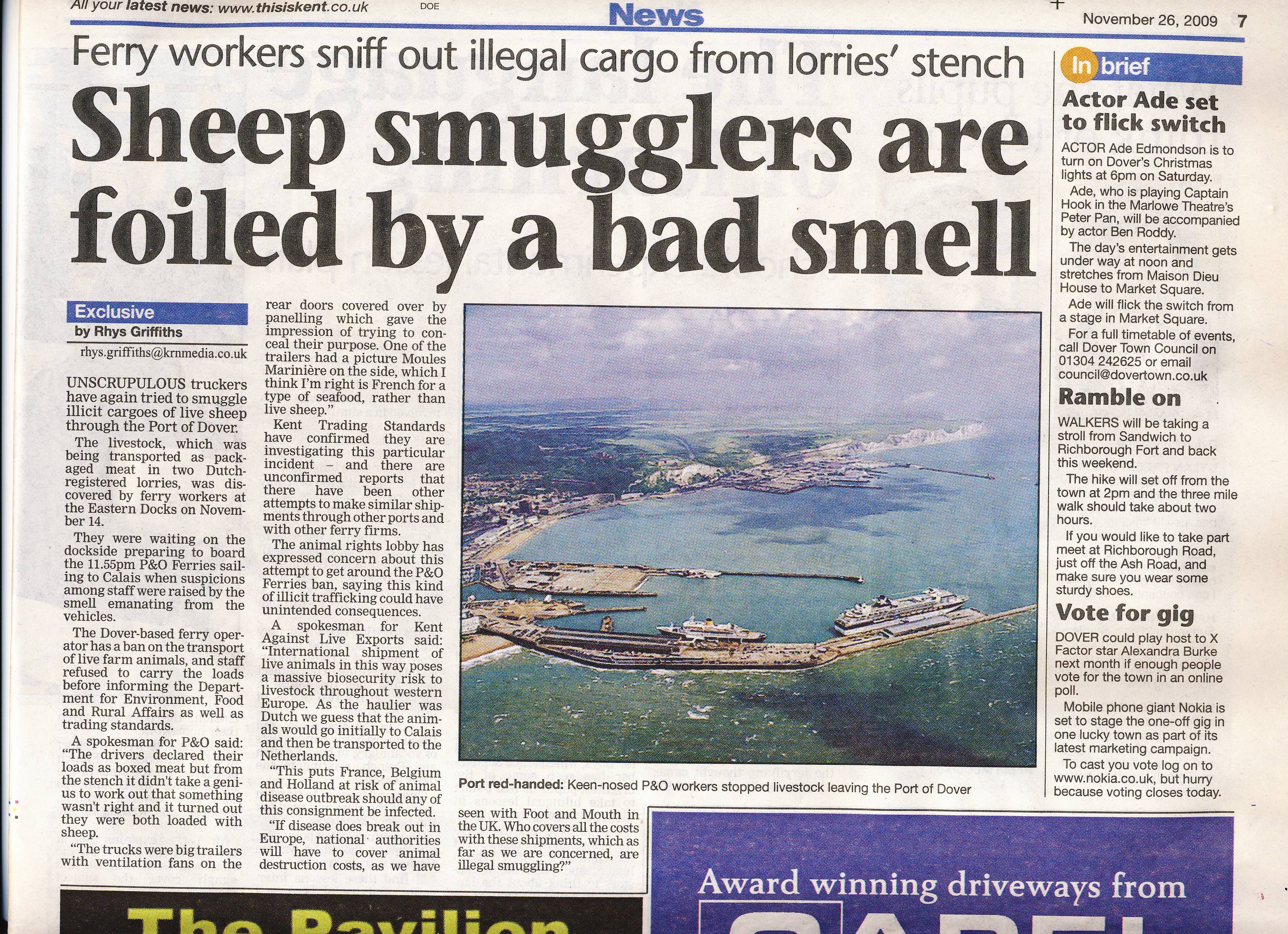 As a last and desperate attempt to continue getting live animals to Europe, hauliers and exporters have even attempted to take live animals out of English ports such as Dover http://en.wikipedia.org/wiki/Dover and Ramsgate http://en.wikipedia.org/wiki/Ramsgate by trying to declare the consignment as ‘boxed meat’.