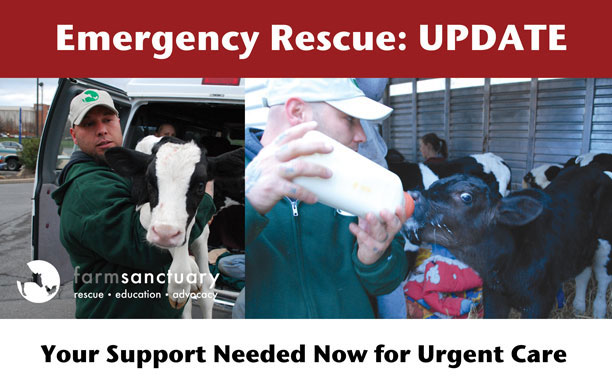 Last week, we wrote to you about six newborn male calves found starving and nearing death at a farm where some were tied to a tractor and others were abandoned in a garage. Thanks to an outpouring of support from members like you, Farm Sanctuary immediately launched a rescue effort and brought these helpless babies into the arms of emergency caregivers.