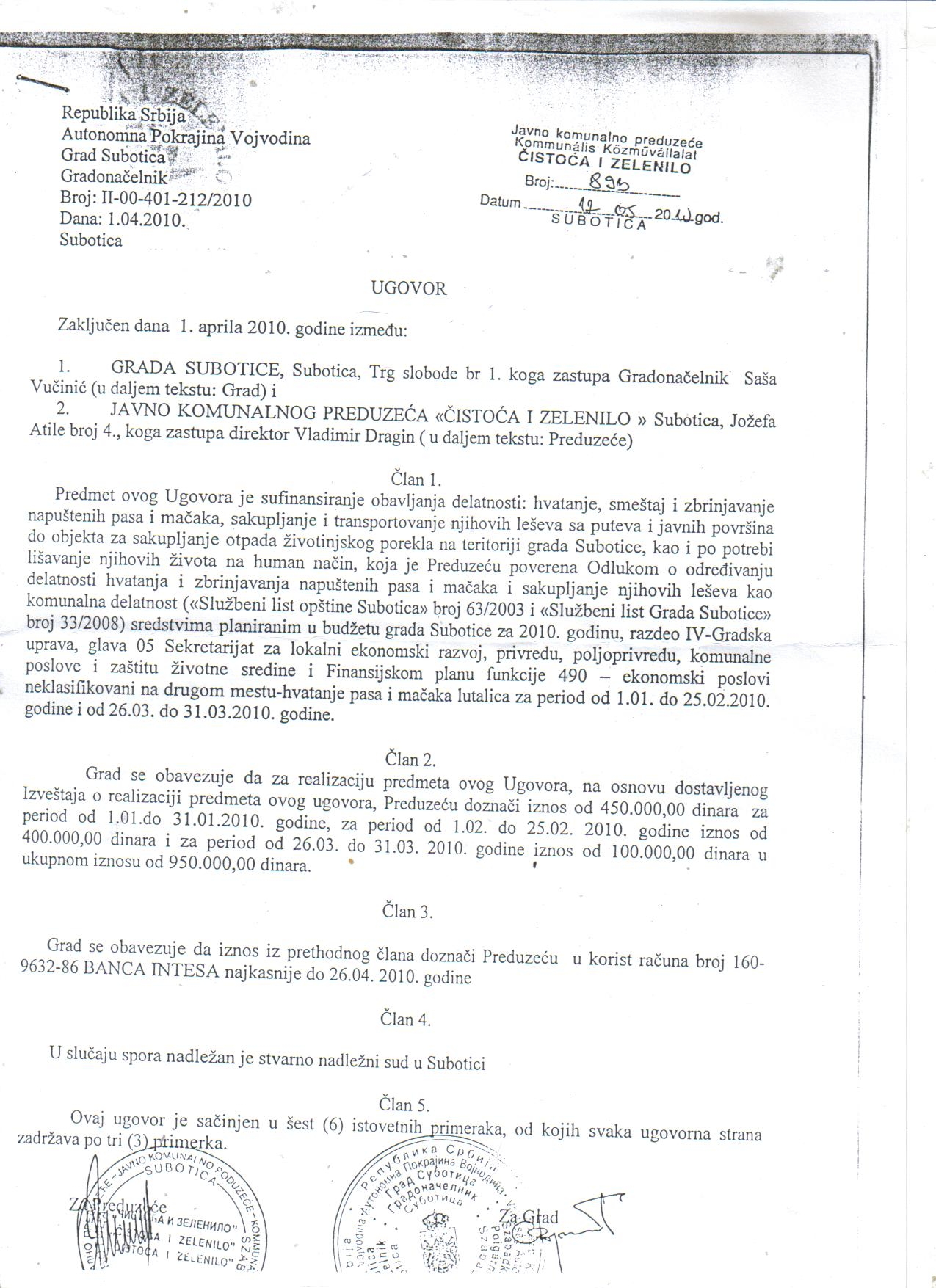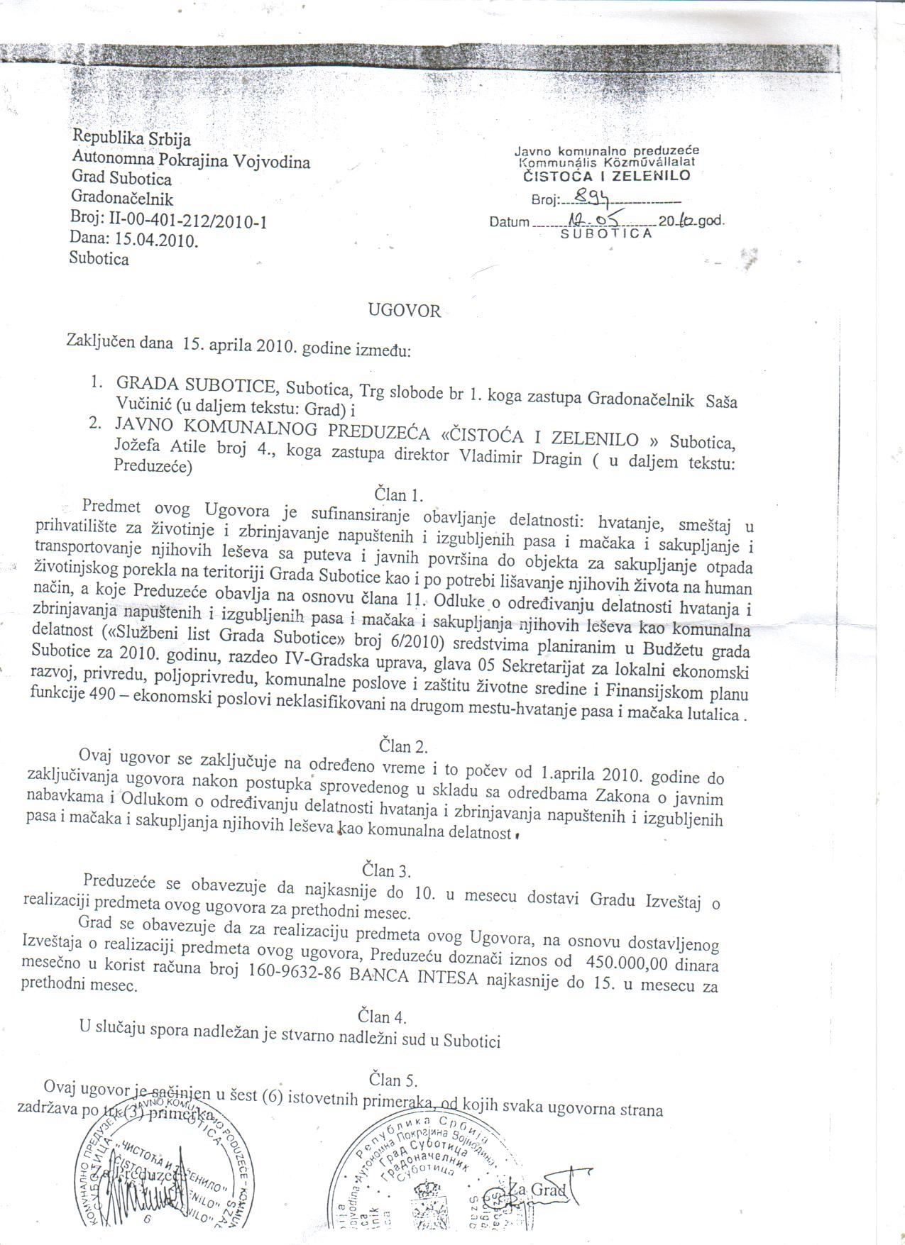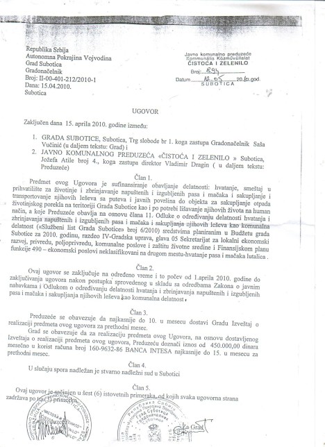 We now have copies of the contracts between the Subotica government / authority and the public garbage firm ‘JKP Cistoca i zelenilo’ who have the contract to capture (and subsequently kill) the strays in the city.