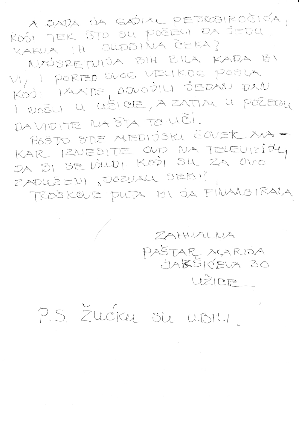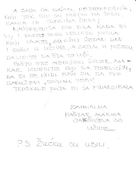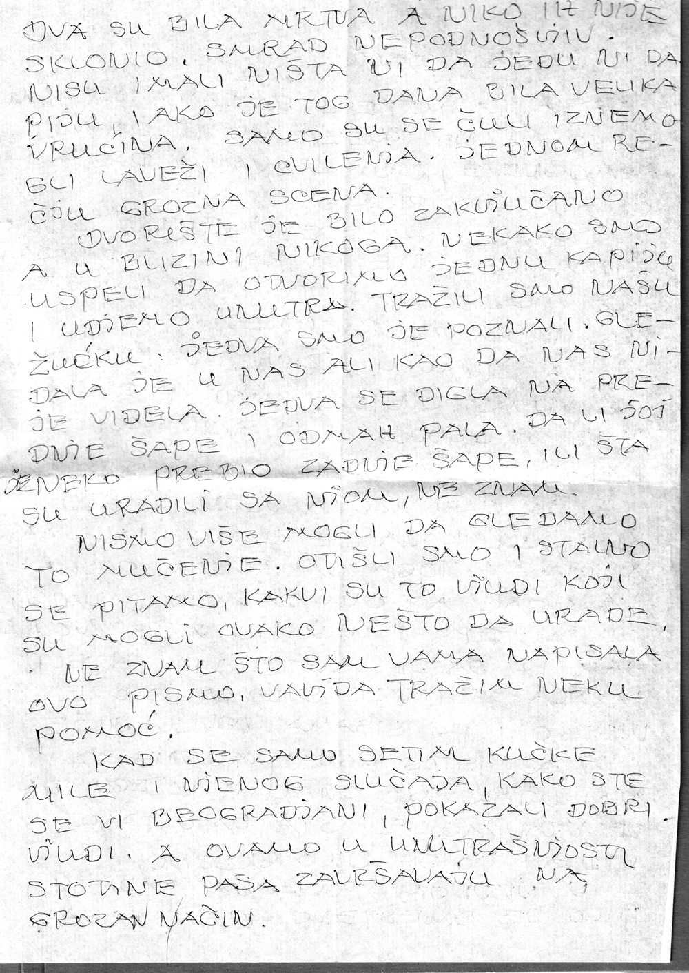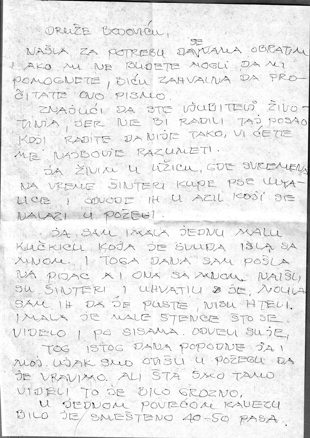 A letter provided by a citizen of Uzice city says that shinters have caught her little dog. The lady in question writes that she went to look for this pound. She understands that her dog was killed. The lady still had 5 puppies belonging to this dog. The next day shinters went to the house of the lady saying that they wanted to take the puppies and kill them also.