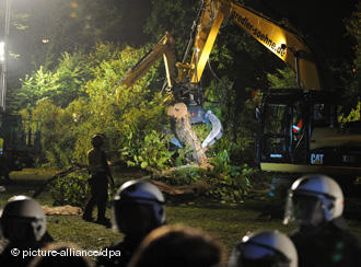 Thousands of demonstrators have been held back by a chain of police officers as work begins on cutting down trees in a Stuttgart park. The trees are being cleared for building work on the “Stuttgart 21” rail project.