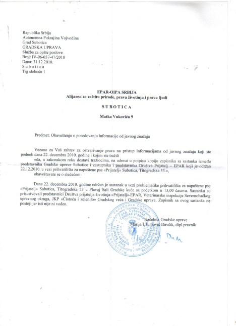 The letter (below) is about the legal obligation of the city authorities and the organisation Friend-EPAR (President : Branka Bojanin) regarding the matter of the lawful treatment of stray dogs in all places where stray dogs live ( there are 3 places with large numbers as follows):