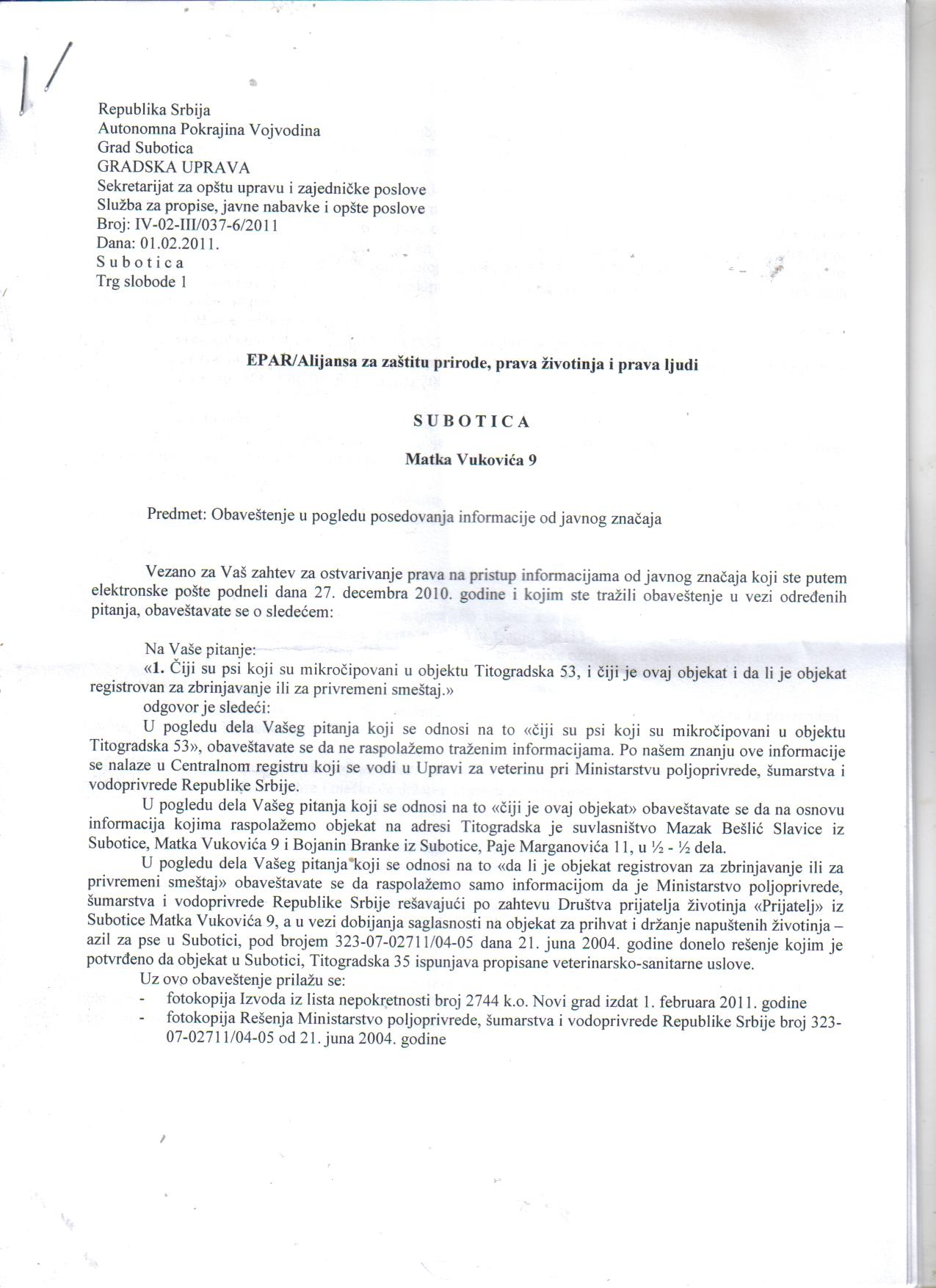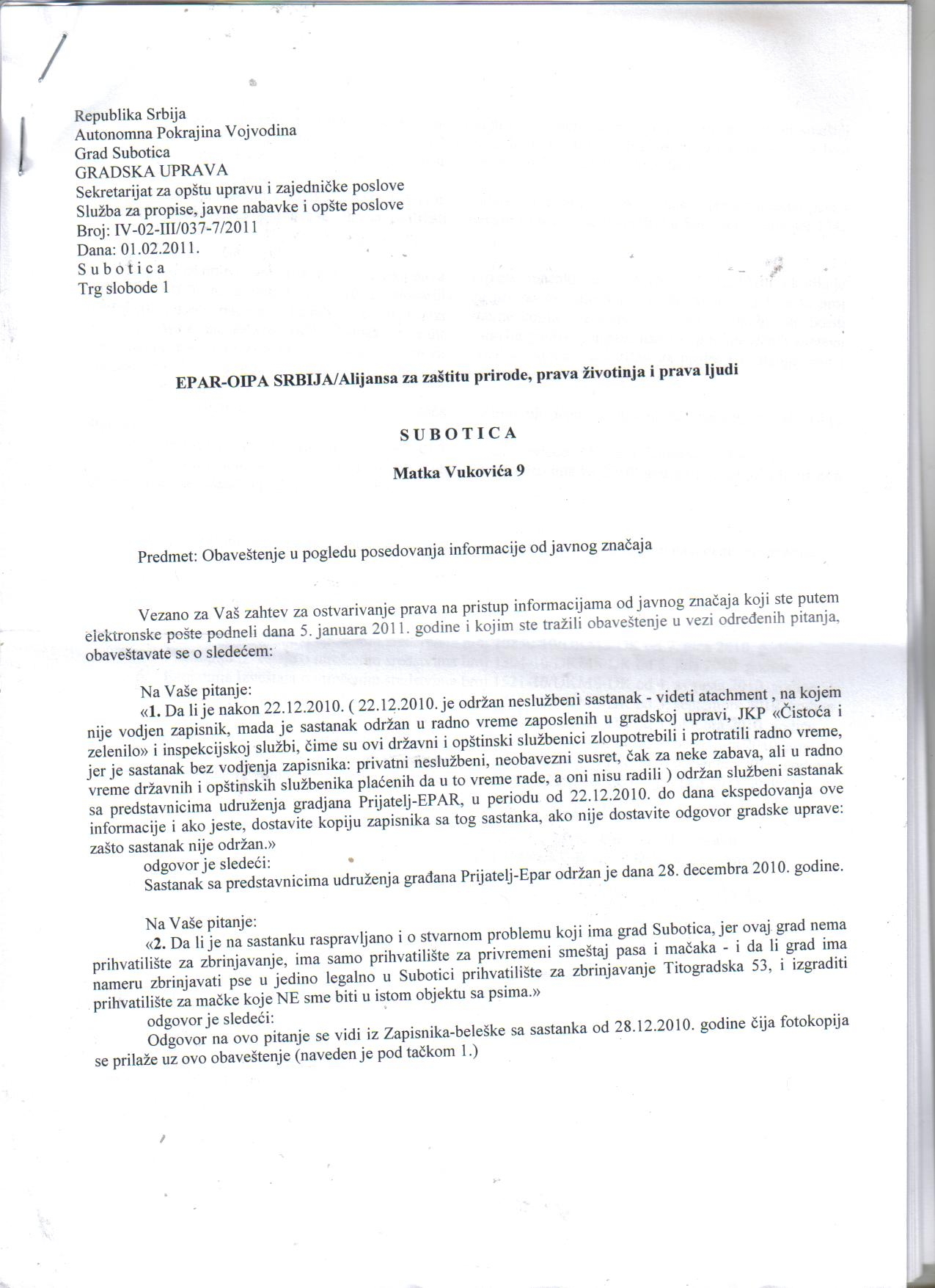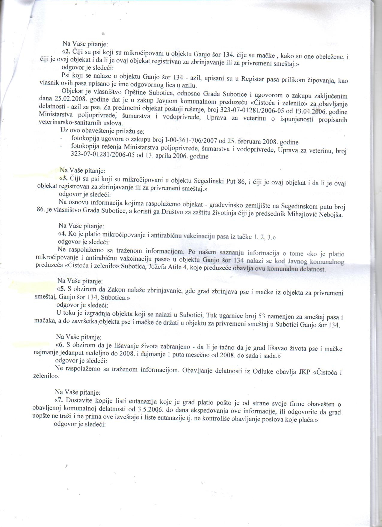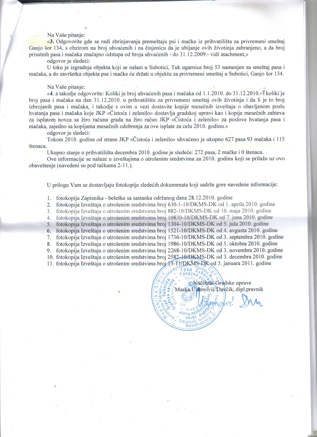 s obzirom pomenute gospodje neodgovorno tvrde da Grad , tj Gradska Uprava postupa zakonito prema uhvacenim neobelezenim psima i mackama nepoznatih vlasnika i da ce isto tako zakonito postupati i prema psima koji sada zive u legalnom prihvatilistu Titogradska 53, a znaju da grad postupa nezakonito i prema uhvacenim psima i mackama koje uhvati zoohigijenska sluzba grada , znaju jer to finansiraju u ime svih poreskih obveznika – nezakonitost postupanja Grada dokazuje Odluka Ustavnog suda Sl.gl.RS 9/2010 , jer grad IH i dalje LISAVA ZIVOTA NAJMANJE 1 PUT MESECNO koristeci usluge vet.stanicer `Veterinar` . Po izvestaju zoohigijenske sluzbe grada Subotice uhvaceno je 1508 pasa i 99 macaka od 3.5.2006. do 16.11.2010. , a brojno stanje je 16.11.2010. : 201 pas i nijedna macka po izvestaju JKP`Cistoca i zelenilo` na dan16.11.2010. ,stoga trazimo hitan odgovor, a u pitanju je oko 100 miliona dinara javnog novca kojim je placeno postupanje prema 1508 pasa i 99 macaka u Subotici :