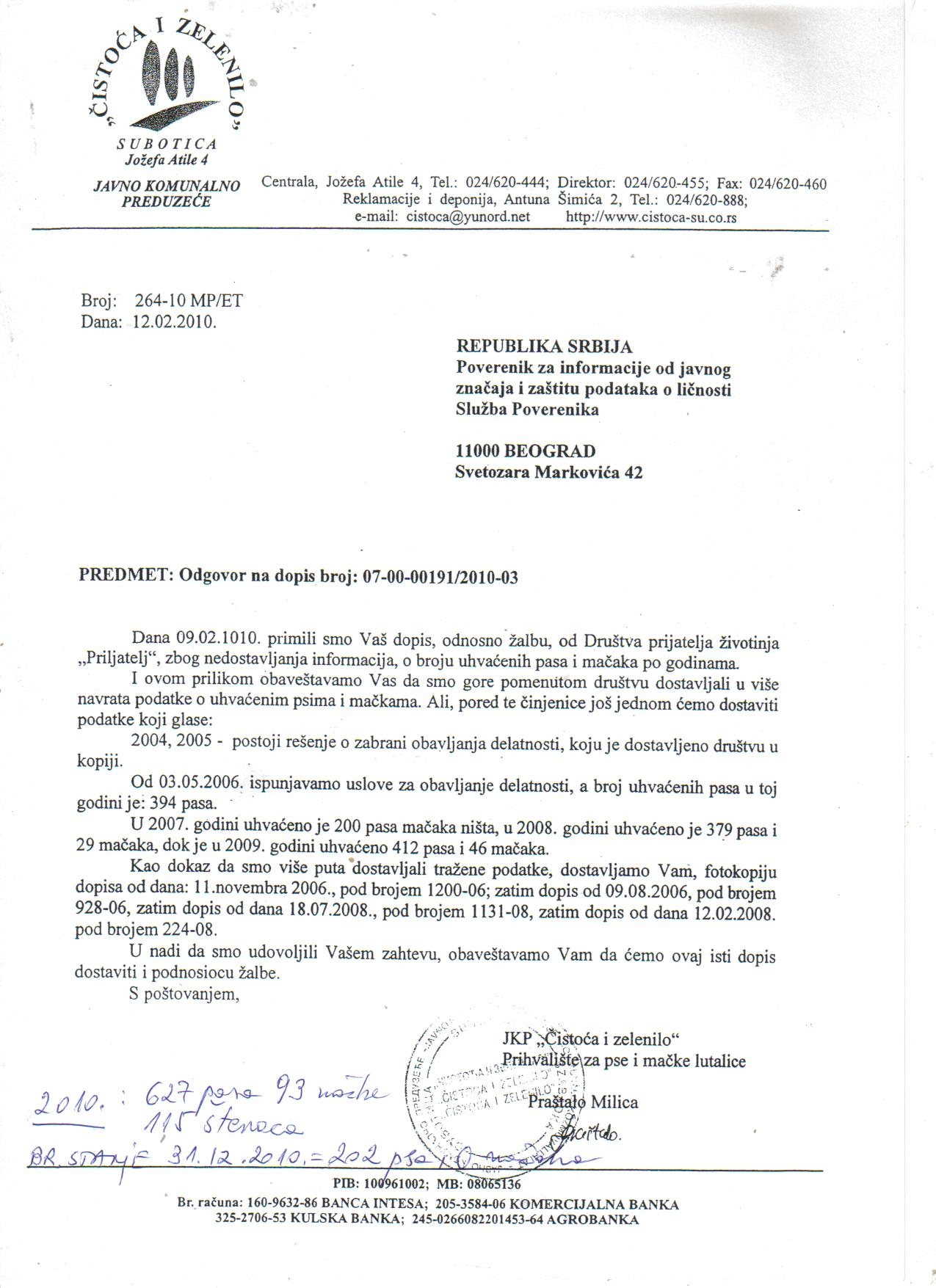 neispunjavanja zakonskih obaveza gradske uprave- odgovorna lica: g.Matilda Seker I g. Suzana Dulic i JKP `Cistoca i zelenilo`, Subotica- odgovorno lice g. Vlado Dragin , koji su po Zakonu o veterinatsrstvu i Zakonu o dobrobiti zivotinja : duzni omoguciti zbrinjavanje u prihvatilista : svih napustenih pasa na svojoj teritoriji – bez ubijanja.