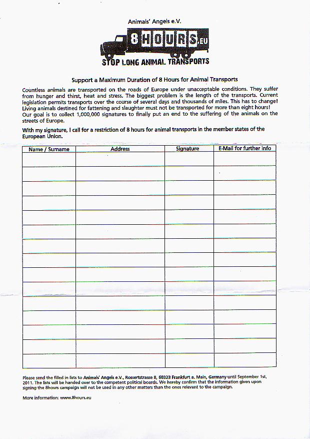 Completed forms can be sent to Animals’ Angels e.V. in Germany – the full address is provided at the bottom of the form as per the example sheet above. Completed forms need to be sent to Germany by end of August 2011. The forms, as well as the online petition (link above) will then be presented to the competent political boards of the EU in September.