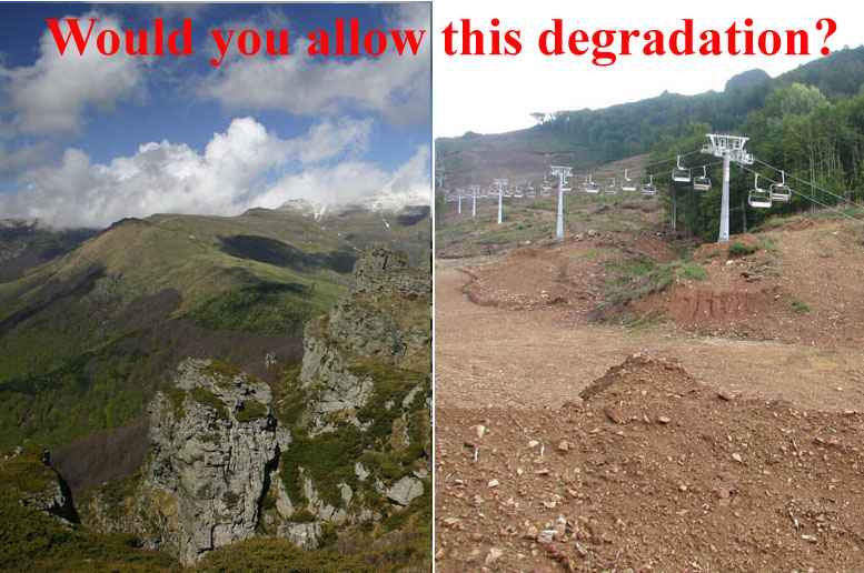 Construction of ski tracks (which involves both logging and bulldozing activites) on fragile steep slopes will unavoidably begin a process of erosion; this has already happened on some parts of the mountain where development was illegally started.