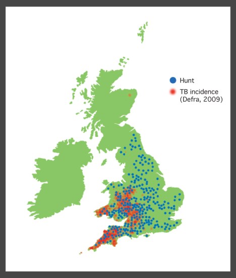 By overlaying visual illustrations of the two sets of statistics there is a clear correlation: the greater the number of hunts, the higher the rates of TB, higher than in other areas of the UK.