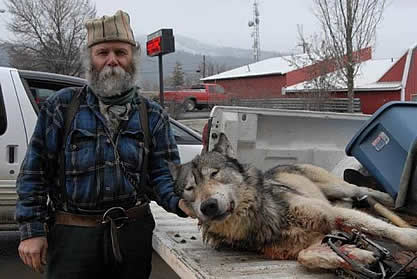 A photo downloaded from an online trapping forum shows an Idaho trapper posing in front of a wolf that was caught in a foot-hold trap and then allegedly shot at by bystanders. Missoula-based anti-trapping group members say they received death threats after posting the photo on their Facebook page. PHOTO COURTESY EARTH ISLAND JOURNAL.