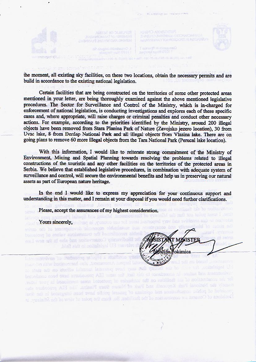 It appears that the EU Commission does not really care about the situation of further environmental destruction within Serbia, simply referring us back to past correspondence between the EU and Serbian authorities, in which the Serbian authorities claim that they really care about the environment; when in reality, it would seem ok to apply for approval to the Ministry undertake constructions in protected areas only once all the construction work has actually been done !!