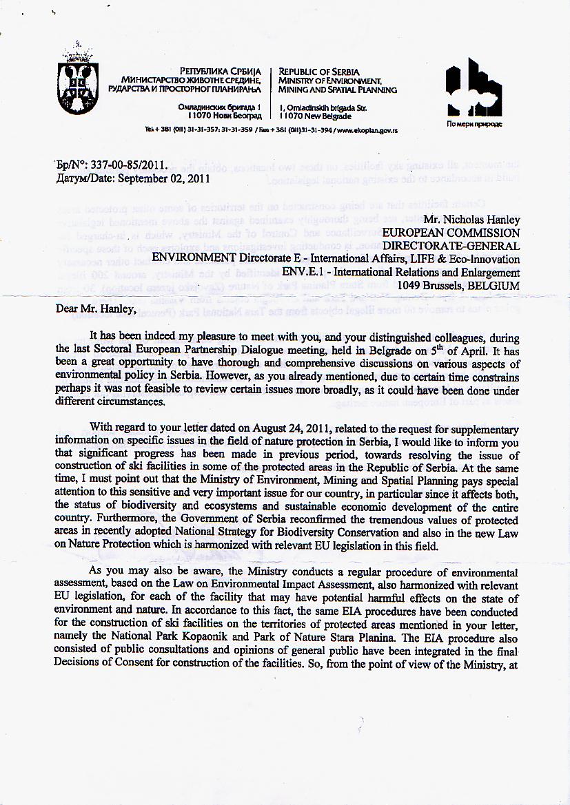 To further the campaign with the EU Environment Commission and also the EU Enlargement Commission, Serbian environmental campaigners also wrote (12/06/12) to the EU, as well as to the Ministry of the Environment within Serbia.