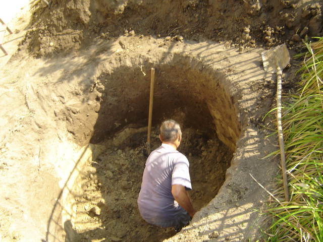 The new septic tank hole has been dug down to a depth which permits alignment to the existing sewer and the septic tank itself has been built up. The walls of the excavation serve as the outside layer; a removable concrete slab has been placed over the tank. This new septic tank will be connected with the old one by a pipe. Solid waste will continue to accumulate in the old septic tank, while the liquid will flow through the pipe into the second tank. The liquid will then drain through holes in the walls and then into the soil. The entire sewer line has been removed and replaced with a new one. The old drain pipes from the kitchen were too narrow and too low, with insufficient fall in, so they have also been replaced and attached to the main sewer line. Now the kitchen and toilet drain pipes run through the newly built manhole and into the main line. To accomplish that, it was necessary to dig all the way from the bathroom to the kitchen drain. The kitchen sink drain pipes will also need to be replaced with new ones.