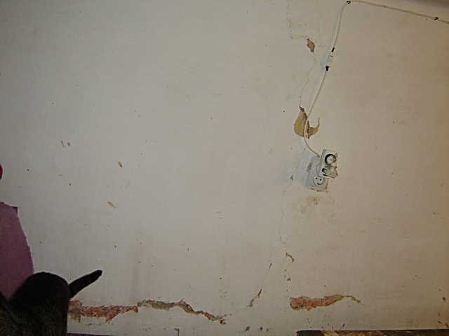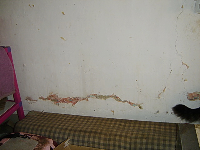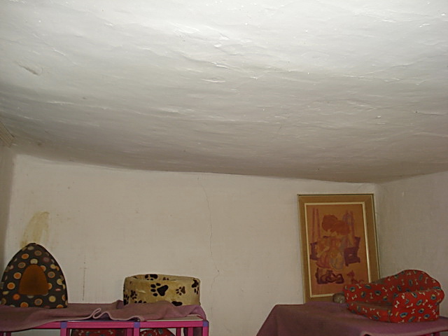 As to the auxiliary rooms themselves, they have originally been made of bricks and rammed earth. If we want to fix them permanently, special nets should be adhered to the inner walls and Bavalit applied afterwards. Bavalit is a kind of mortar, a mixture of hydraulic binders, mineral aggregates and additives. Then the new insulation layer can be added to the ceiling and we would have a nice and safe indoor enclosure. The only cat room in the front yard is in the worst shape, with a huge bump in the ceiling caused by moisture, and a number of cracks in the walls. If enough of the ceiling gets wet, it will become too heavy to support itself and will collapse on my unsuspecting cats! We have to fix it ASAP!