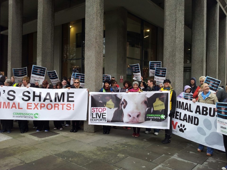 More than 100 people protested outside the Dept of Agriculture in Dublin over the reopening of the live cattle trade to Libya, and vowed to step up their campaign in the coming weeks. Libya banned imports from the EU in 1996 because of the BSE outbreak but recently lifted the ban. The first shipment of almost 3,000 Irish cattle went to the Middle East in February.
