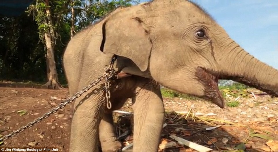 During the filming, a helpless, emaciated baby male elephant called Raja, who was barely a year old, was found in a village, shackled with heavy chains to a tree. He had been taken hostage by the villagers, who were demanding compensation from the Sumatran government for the damage his family had done to their crops.