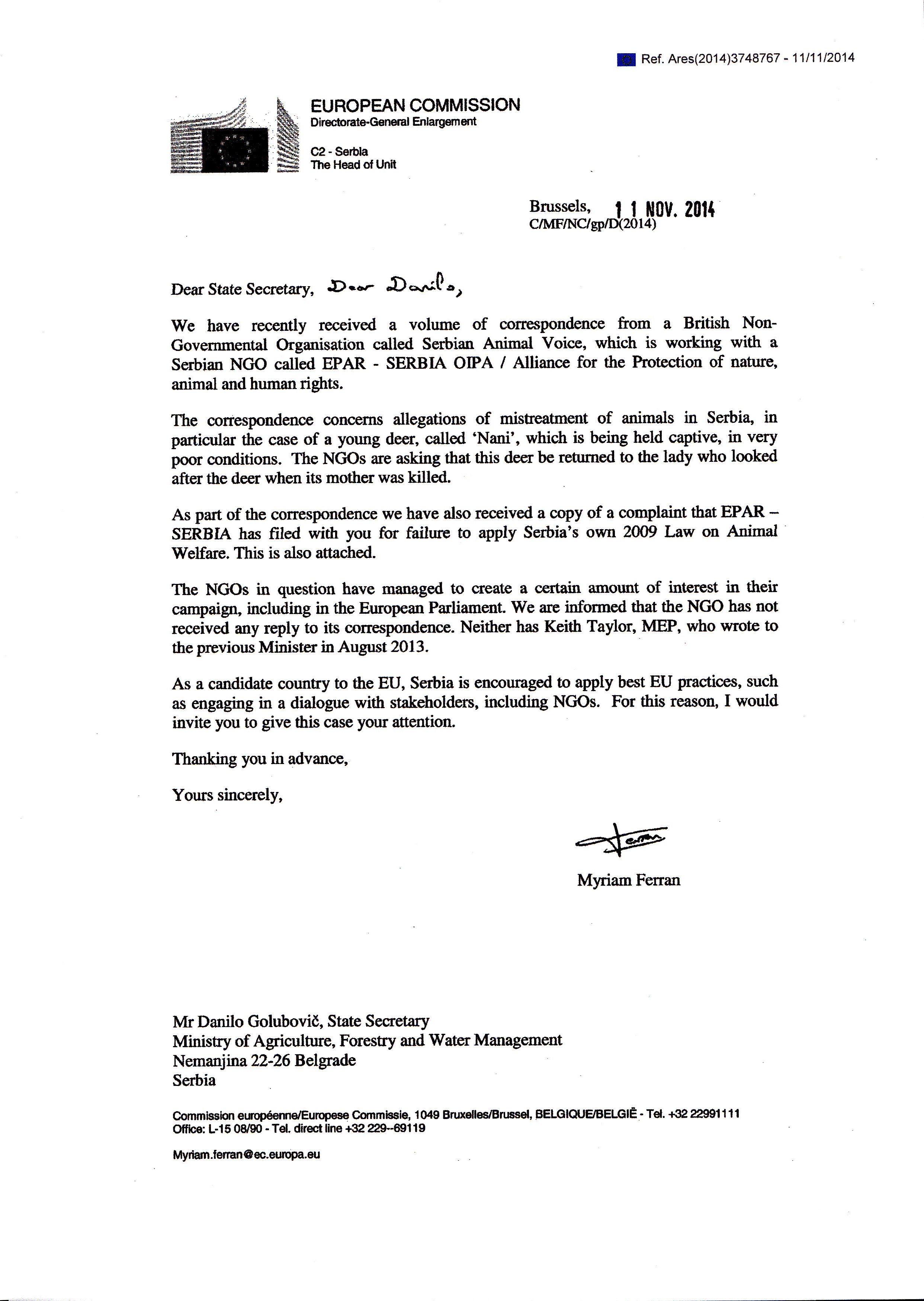 As you can see from the letter above, the EU Commission on Enlargement has now written to the Serbian government regarding the situation of Nani.