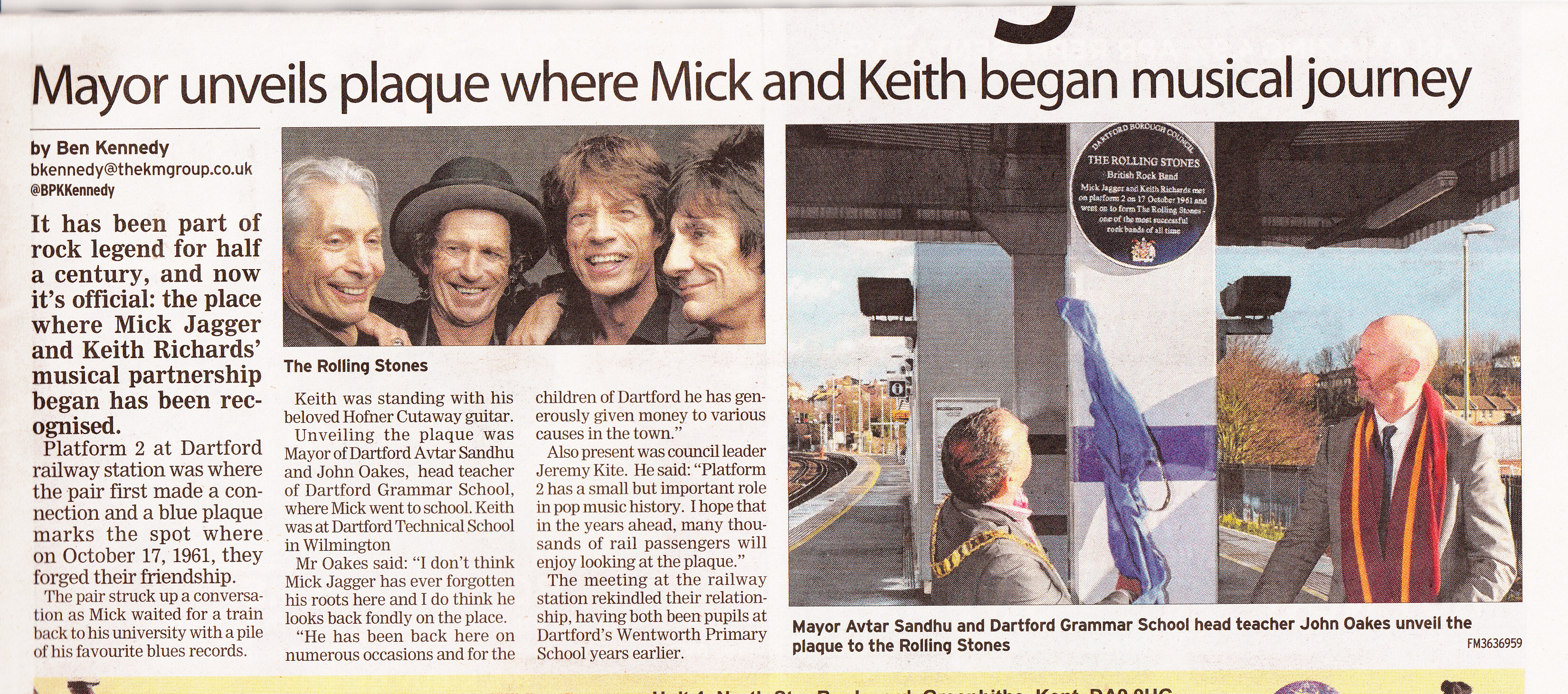 Well finally; and much too late in my own opinion; Platform No. 2 at Dartford station, Kent, South East England; has finally erected a plaque in memory of the place where one Mick Jagger met with a young Keith Richards on October 17th 1961 – and a friendship which went on to become known throughout the world as the ‘Rolling Stones’.