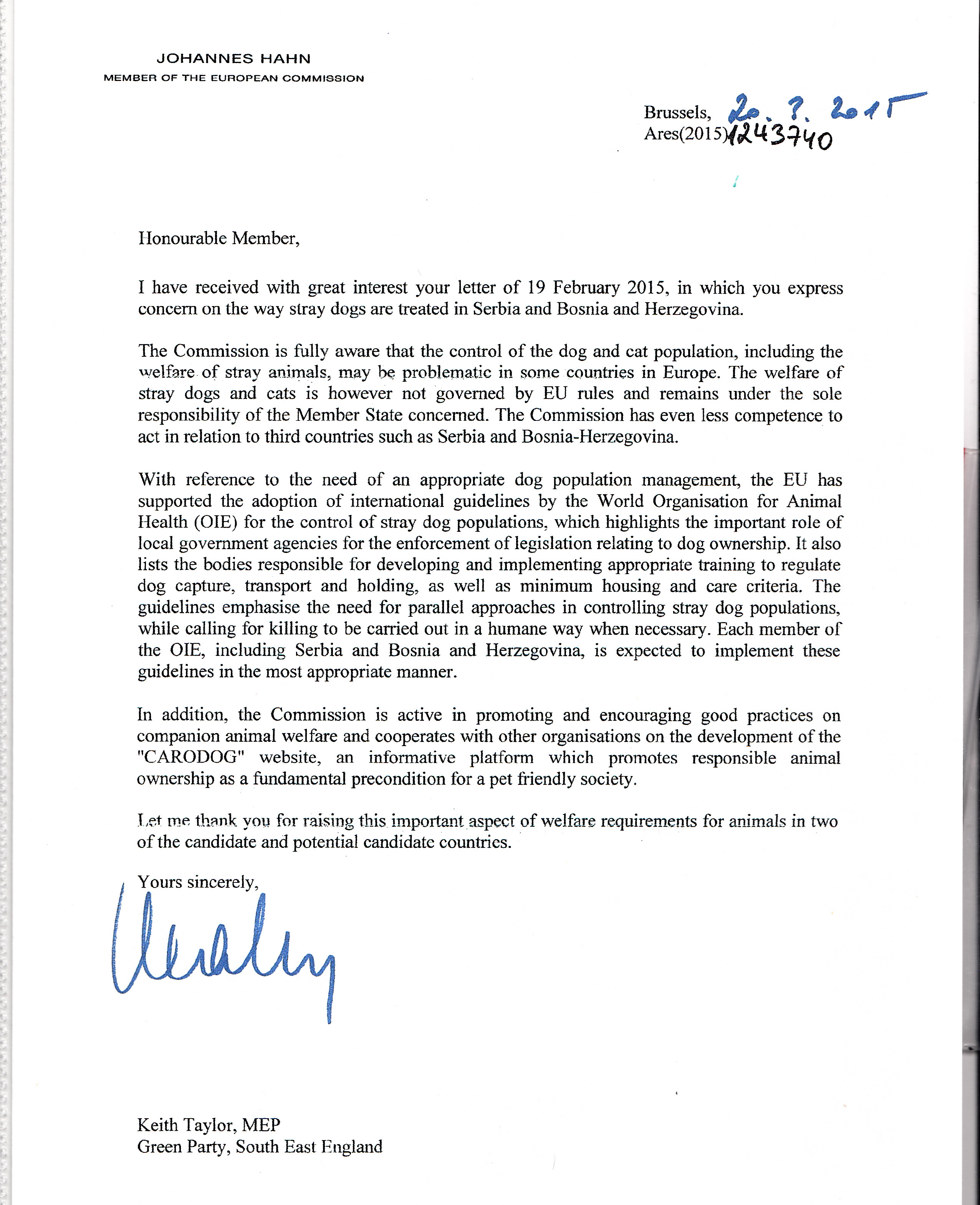 As Commissioner Hahn says, the welfare of stray dogs and cats is not governed by EU rules and instead remains under the sole responsibility of the member state concerned. However, as detailed in the second paragraph of his letter, we do feel that as the EU Commissioner responsible for EU enlargement, which currently includes Serbia, the Commissioner is in a much stronger position than he makes out to be able to further communicate with the Serbian government regards expressing concerns of many animal welfare organisations, including ourselves.