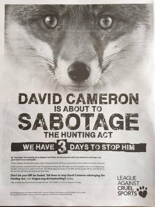 Things are going absolutely mental in England over David Cameron and his attempt to overturn the current hunting act which has been legislation for the past 10 years. He is just doing this in a pathetic attempt to please the hunting fraternity of which he is one – sort of look after your mates and stuff the people who are anti hunt.