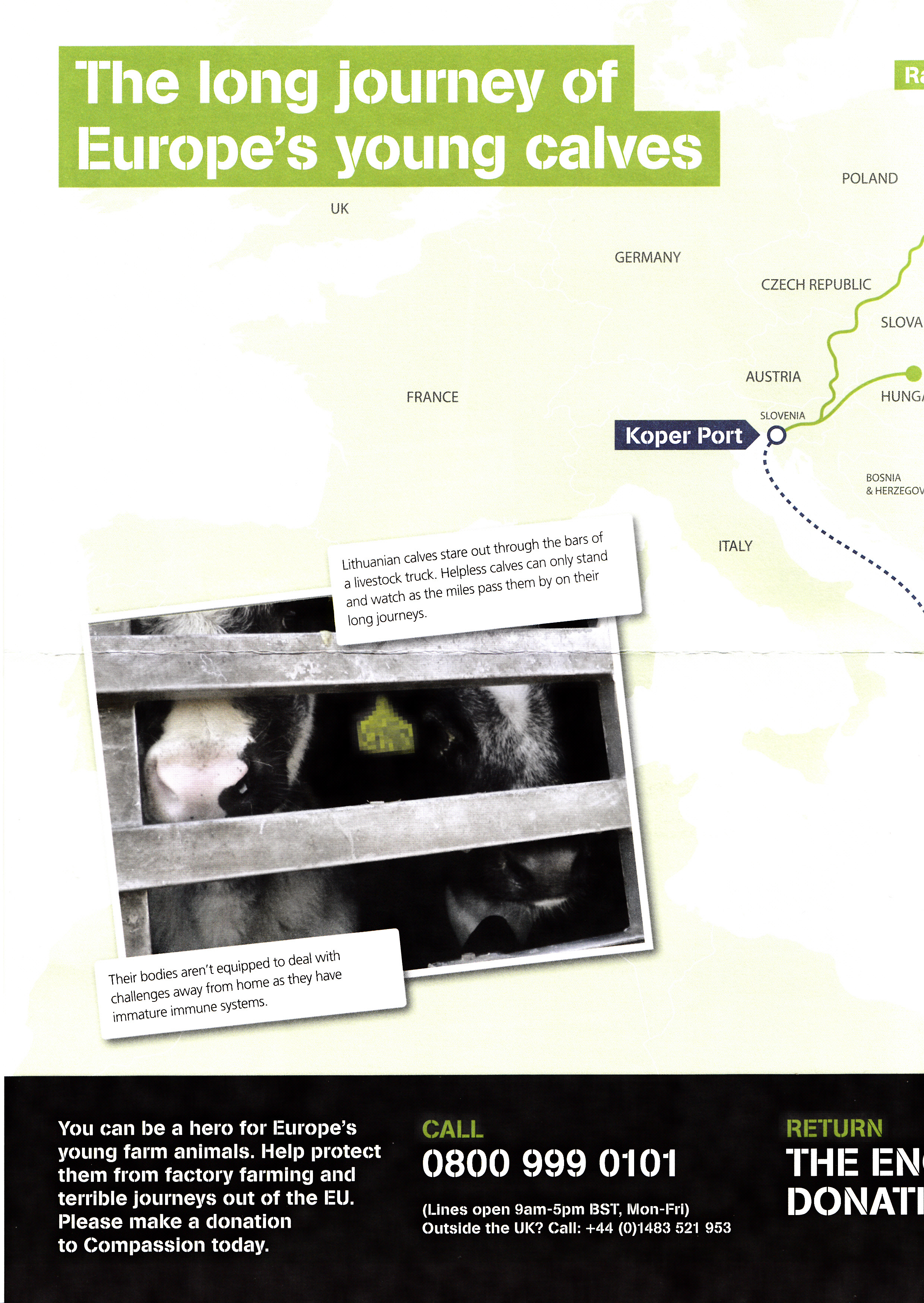 A recent investigation by CIWF (England) showed very young Lithuanian calves being first sent by road to the port of Koper in Slovenia. A distance of approximately 1030 miles. Many of them were to weak to stand, but they were still loaded at the point of origin for departure to Koper.