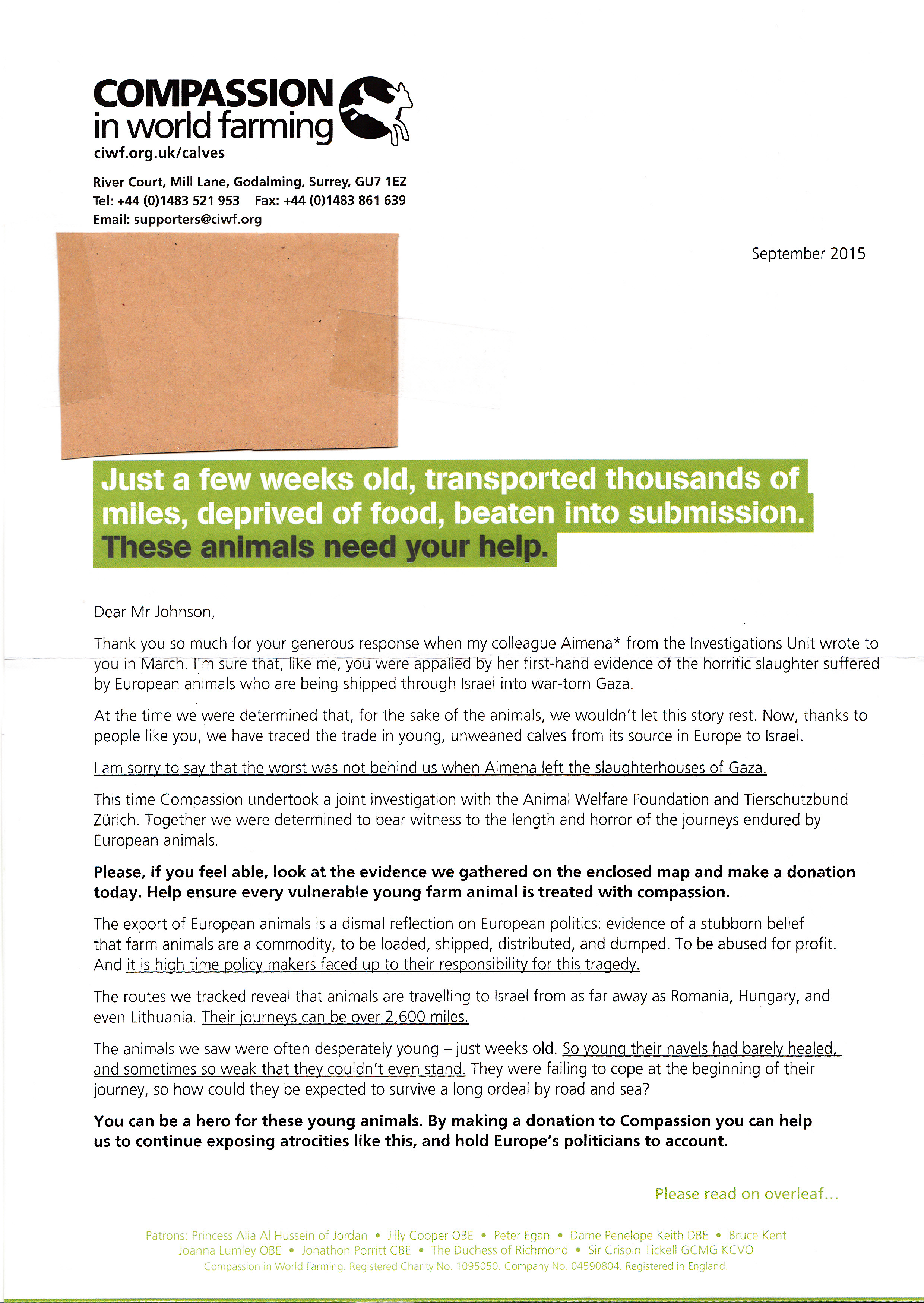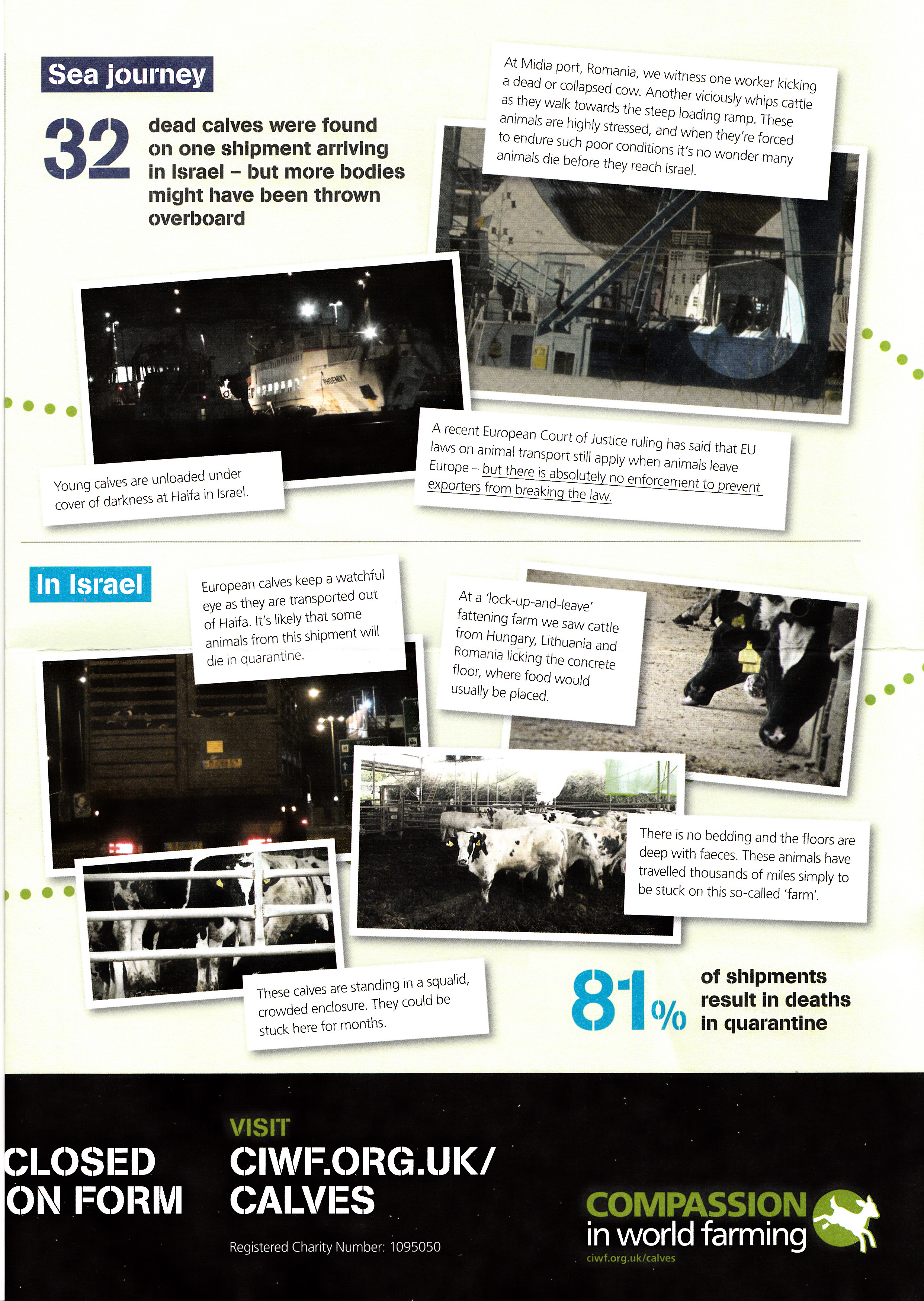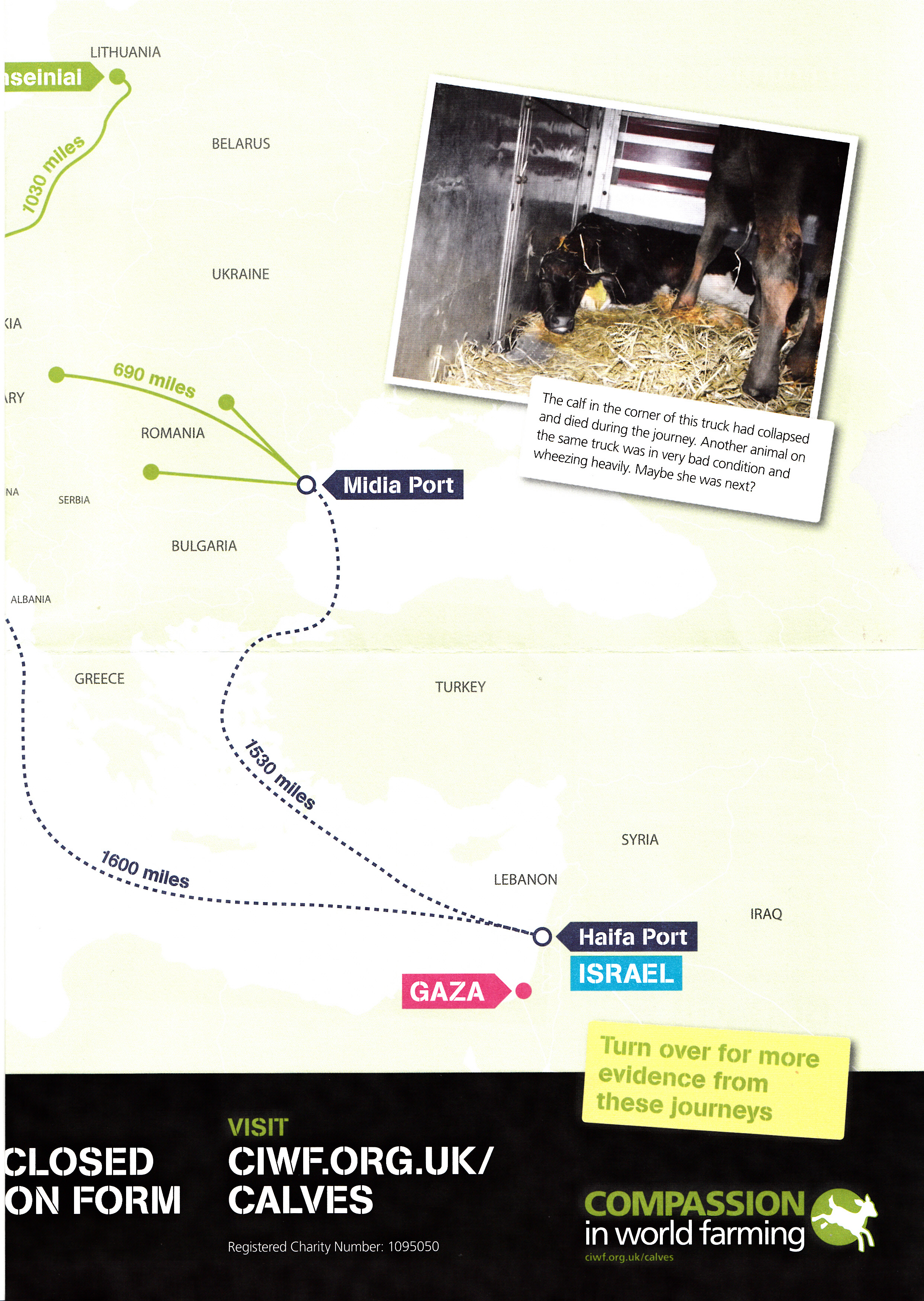 My letter mainly involves the very recent expose by Compassion In World Farming (CIWF); also based here in England – http://action.ciwf.org.uk/ea-action/action?ea.client.id=119&ea.campaign.id=41392&ea.tracking.id=05bb9ddb and the issue of very young calves being exported for slaughter from locations such as Lithuania and Romania (in the EU) to Israel and Gaza (non EU).
