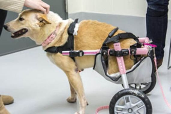 Willow took Scooter to meet Dr Frye at Cornell University where work began on a specially constructed cart. Scooter was hesitant the first time she tried to use the cart and just stood there lifting her front legs up and down. And then Willow moved away to the corner of the room and called her.