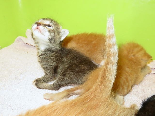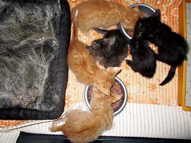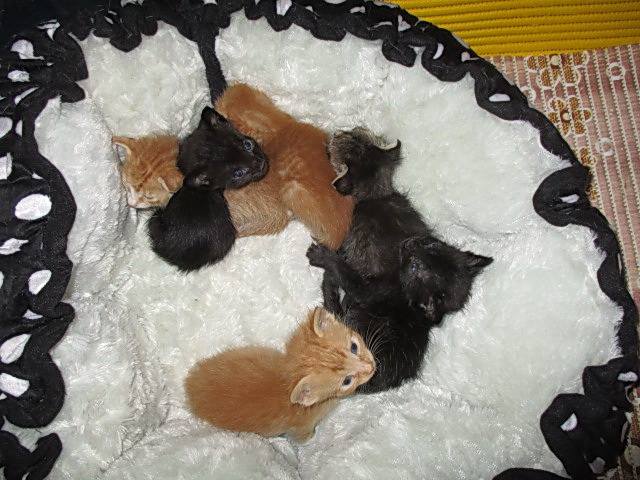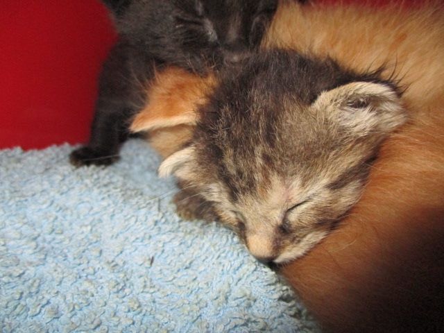 OK, rant over. These six babies were left in a cardboard box in front of the mall when they were maybe 10 days old. Two of them hadn’t even opened their eyes yet because their eyelids were glued shut with pus. They have been hand raised and bottle fed for a month now, as they were not progressing the way they should; moreover, all of them had a chlamydia infection and ringworm. Just great. Five of them finally pulled through and began to eat on their own, but the tiniest one, a little black girlie with a white tip to her tail, who had been the smallest and weakest from the very beginning, seemed to be dying a week ago. She had been given strong antibiotics for days and then the UV scan showed that her liver and stomach were enlarged, so more drugs (vitamins and hepatoprotectives) were added to her daily therapy.