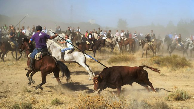 The Toro de la Vega “festival” has, until now, taken place every September in the autonomic region of Castilla y Léon, Spain. The event entails chasing a young bull through the streets of Tordesillas and stabbing him with darts and spears until he is bleeding and crippled. His tail is cut off while he’s still alive. When he dies of his injuries, the person who ultimately killed him is awarded a ceremonial spear and a medal by the city council.