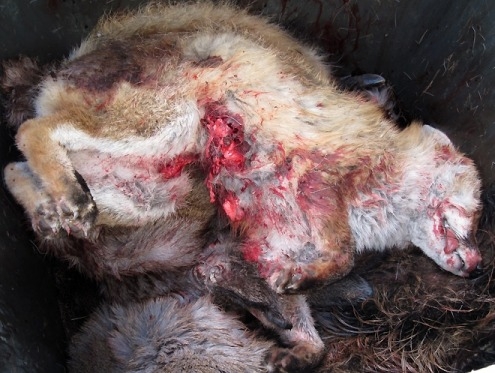 NICHT SO! Sie leiden kläglich in Pelzfarmen weltweit. Dies ist ein Screenshot des Videos eines analen Stromschlags in einer Pelzfarm in Illinois. Sie sterben nicht sofort, sie gehen in einen Schockzustand, während ihre Innereien grundsätzlich vom Strom “gekocht” werden. SEHEN Sie sich das VIDEO an: