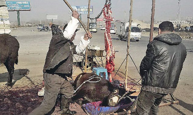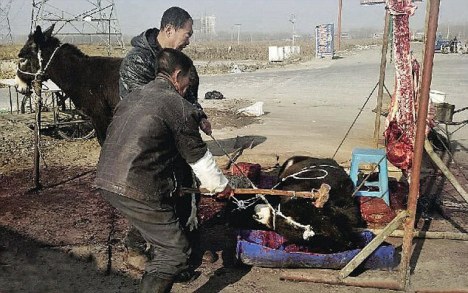 http://www.dailymail.co.uk/news/article-2952313/Customers-watch-Chinese-vendors-sell-fresh-donkey-meat-road-killing-animals-them.html