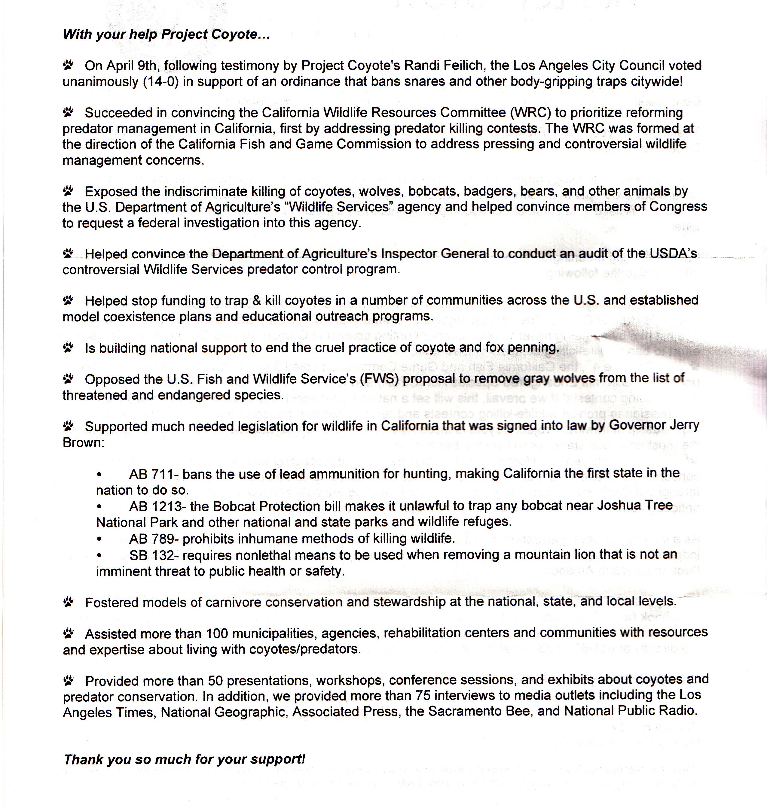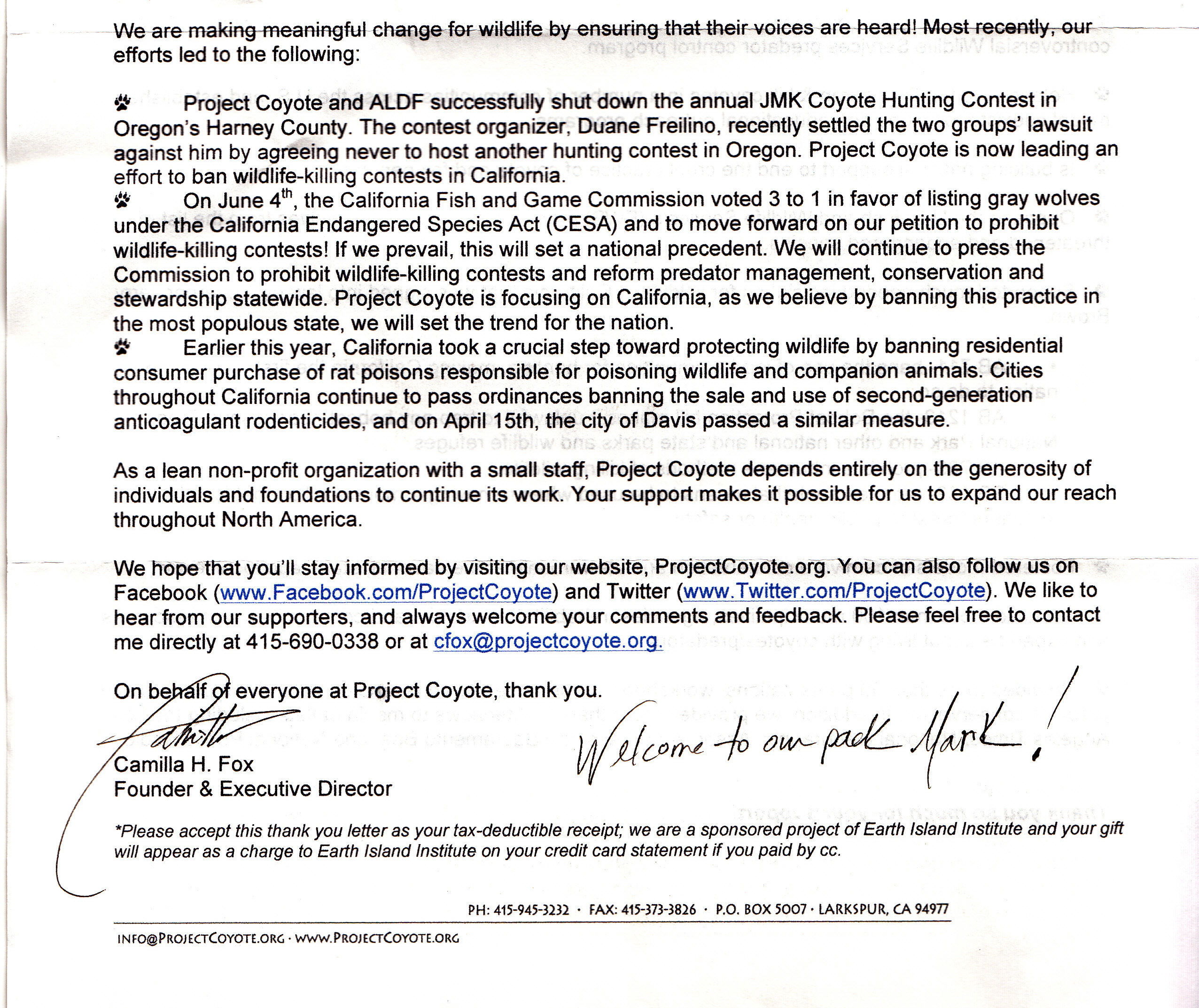 I have just signed up as a pack member of ‘Project Coyote’ which is based in California. As their logo says, an organisation fostering Co Existence – Project Coyote works to change negative attitudes toward coyotes, wolves and other native carnivores by replacing ignorance and fear with understanding, respect and appreciation. All of our work — through education, science, and advocacy — strives to create fundamental and systemic changes in the ways wild carnivores are viewed and treated in North America.