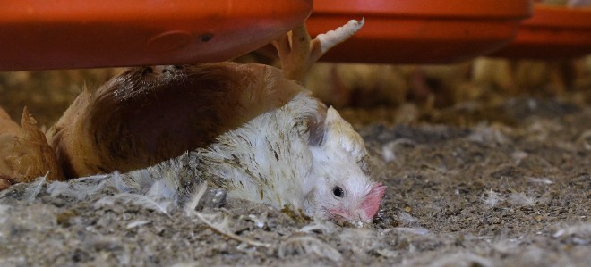 Lame birds in obvious discomfort attempting to walk; birds on their backs slowly dying because they are unable to stand and reach water and birds with red, raw sores from the filthy ammonia-soaked litter underfoot.