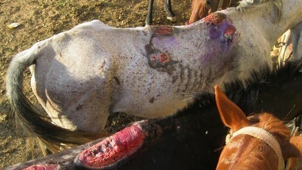 They have medical diseases and conditions and obvious, untreated giant flesh wounds (see photo above) under their saddles and still being ridden. Undoubtedly, they demonstrate distress and are worked or starved to death.
