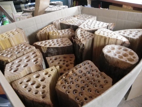 It’s a simple but very important cycle. We prepare all the logs with their many sized chambers and place them into the hotel. The bees go into the log chambers and lay an egg. They also leave a little bit of pollen for the hatchling to feed on when it first emerges within the chamber. After it has laid the egg; the adult bee seals up the egg chamber with mud to keep the egg safe. When the hatchling has emerged (hatched) and eaten in the chamber; it breaks through the mud wall and flies off – hopefully in the direction of the orchards