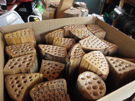 In the workshop -newly drilled logs ready to go out to the hotel.