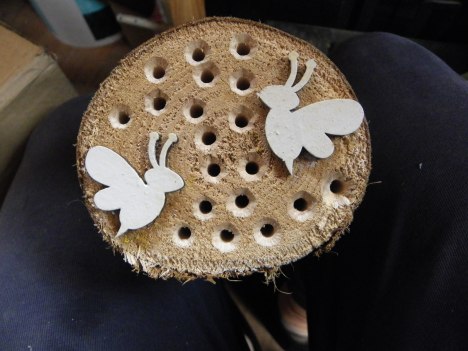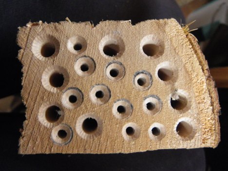 You can look at any of the logs (see photo below) and you can see where many of the chamber holes have been sealed up with mud by the adults. You can also see the chambers which are still empty and ready for other visiting bees to lay their eggs in. The aim is really to get as many of the chambers sealed up with mud as possible; as this indicates that we have a good and constant supply of new young bees in the area.