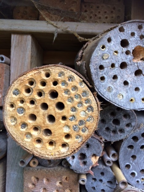Above and below – our ‘Bee Hotel’ created to introduce new pollinators into the orchard. Below you can see all the logs drilled with chambers for the bees to enter and lay eggs. When they do, they seal the entrance with mud, as you can see on some of the chambers above. When it hatches, the youngster feeds on pollen left by the adult in the chamber, and then it breaks out through the mud and flies off to pollinate all the fruit trees.