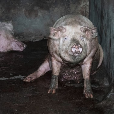 During two visits to Poplar Farm this autumn our investigators found pigs with open, bleeding wounds on their ears; severely lame pigs left in a pen with other pigs; pregnant pigs kept in barren, concrete pens without any enrichment and severely scarred pigs who appeared to be victims of aggression caused by the harsh living conditions.