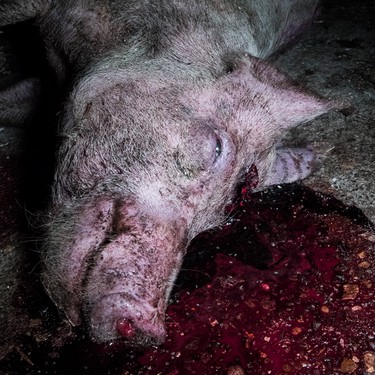 In violation of legislation governing disposal of dead animals – intended to minimise the public health risk associated with diseased animals – two dead pigs were left out in the open yard overnight.One had clearly been shot in the head.