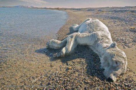 Impact of Climate Change – A picture of a dead polar bear completely out of its environment with no ice anywhere near it’s body.