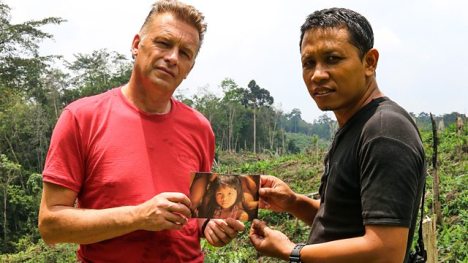 The brilliant Chris Packham (see photo below – red shirt on left) – UK naturalist; goes in search of the lost girl which he photographed over 20 years ago; and who lost her entire family, murdered by the Palm Oil industry.