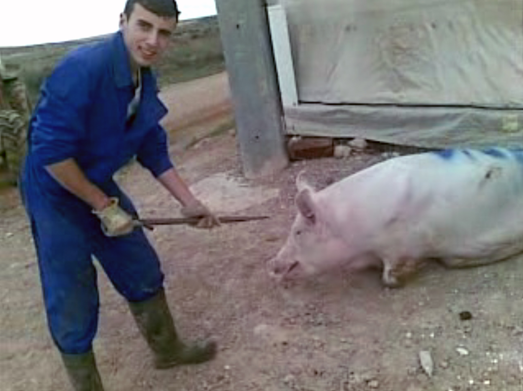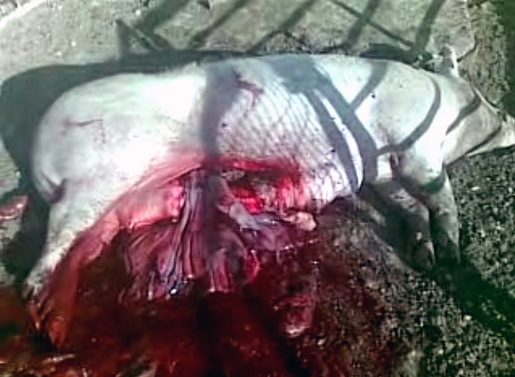 The hitting of a pregnant pig with a bar before cutting her abdomen and