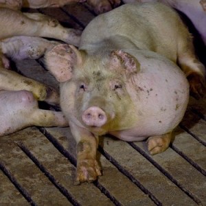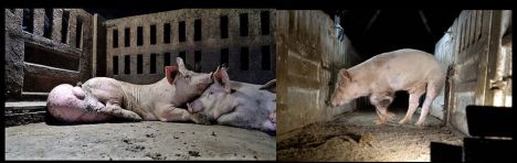 -Pigs that have to live in catastrophic hygienic conditions in their own excrements,