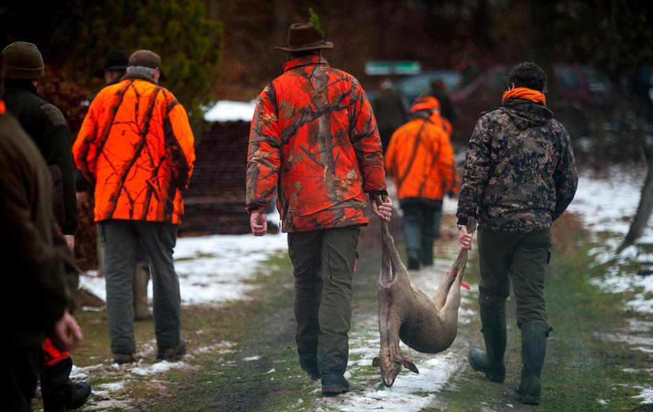 ARCHIVE – Two hunters transport a hunted deer on November 15, 2016 in Niedersachsen after a pressure hunt.