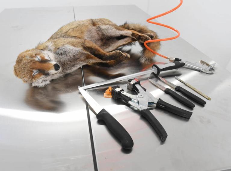 25.06.2018, Baden-Wuerttemberg, Rastatt: In the subtracting room of the “Fur Change” Company lies a deep-frozen fox, and tool for processing the animal on a table.