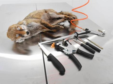 In the stripping room of the ” Fur change ” company, is a frozen fox and tool for processing the animal on a table.