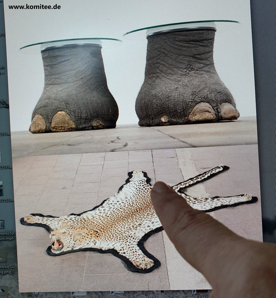 Next year comes the new design creation on the market: tables with poachers’ legs, and carpets made of skinned elephant trainers.